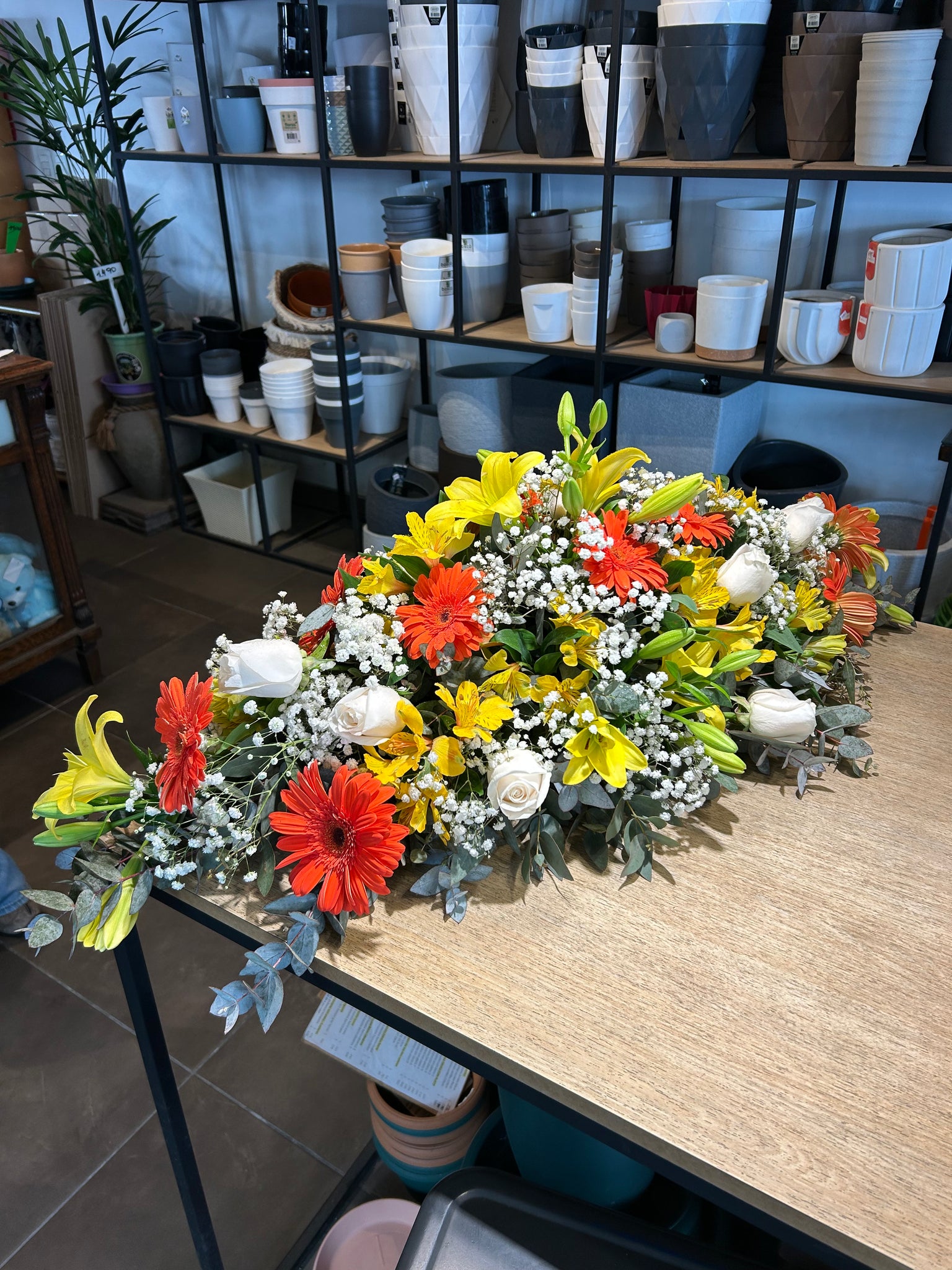 Centro alargado de 90cm de Liliums , rosas y astroemerias, gerberas y ilusión.