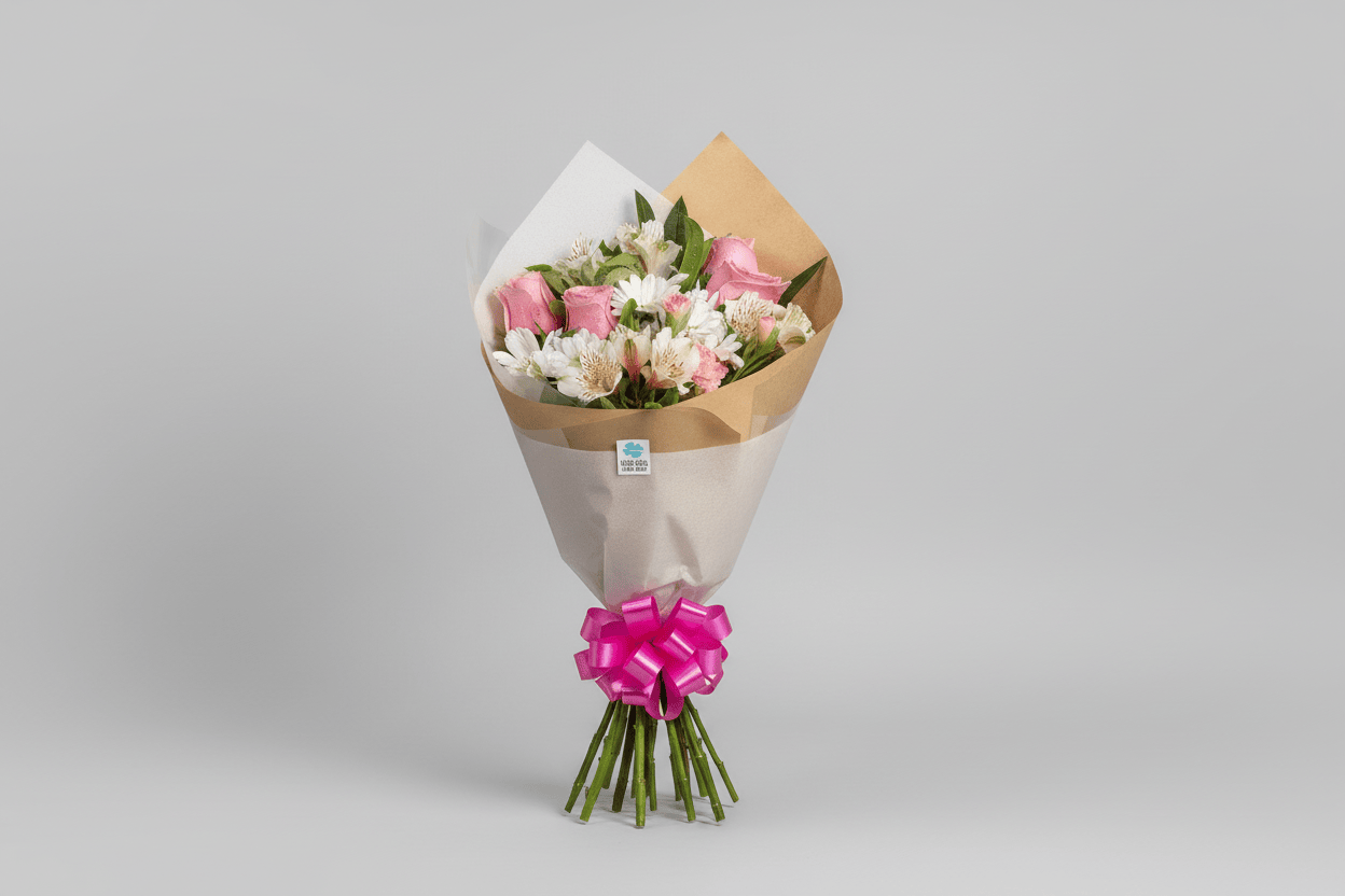 Ramo de 4 rosas , astroemerias, mini clavel y felpillas blancas . El color y flor puede variar dependiendo stock en el momento . Se trata de hacer lo más parecido.